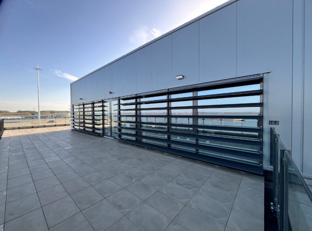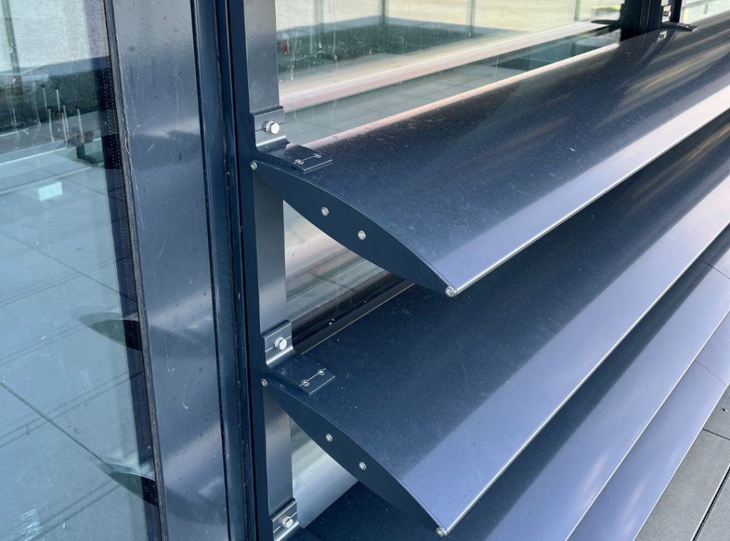 In totaal monteerden wij 155 strekkende meter Capital®-luifels, een post vaste Capital®-lamellenwand en 28 Verano®-ritsscreens.Voor dit project ontwikkelden we bovendien een speciale sierlijst, meegecoat in de exacte bedrijfskleur van het pand.